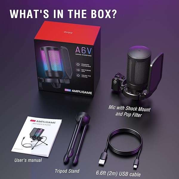 The FIFINE A6V is a plug-and-play USB condenser microphone designed for simplicity and high-quality audio capture. It stands out with its vibrant gradient RGB lighting, intuitive on-mic controls, and a complete accessory kit, providing an all-in-one solution for anyone looking to sound professional and add aesthetic appeal to their setup.