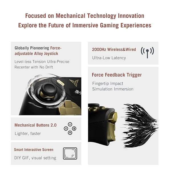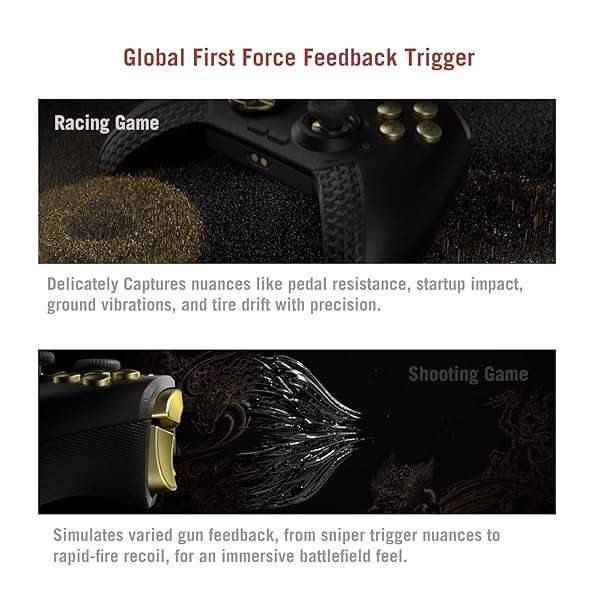 - Hall Effect Joysticks & Triggers: Experience the pinnacle of control with Alloy Hall Joysticks that feature adjustable tension and Force Feedback Triggers. Hall Effect technology uses magnetic sensors, virtually eliminating stick drift and ensuring incredibly precise, ultra-smooth movements without wear and tear. The adjustable tension (from 30-100gf) on the joysticks allows you to fine-tune resistance for your preferred feel, from feather-light to firm and precise. The force feedback triggers provide immersive, adaptive sensations that mimic in-game actions like pulling a bowstring, firing a gun (with modes like Race, Sniper, Recoil, and Trigger Lock), or feeling engine resistance in racing games.